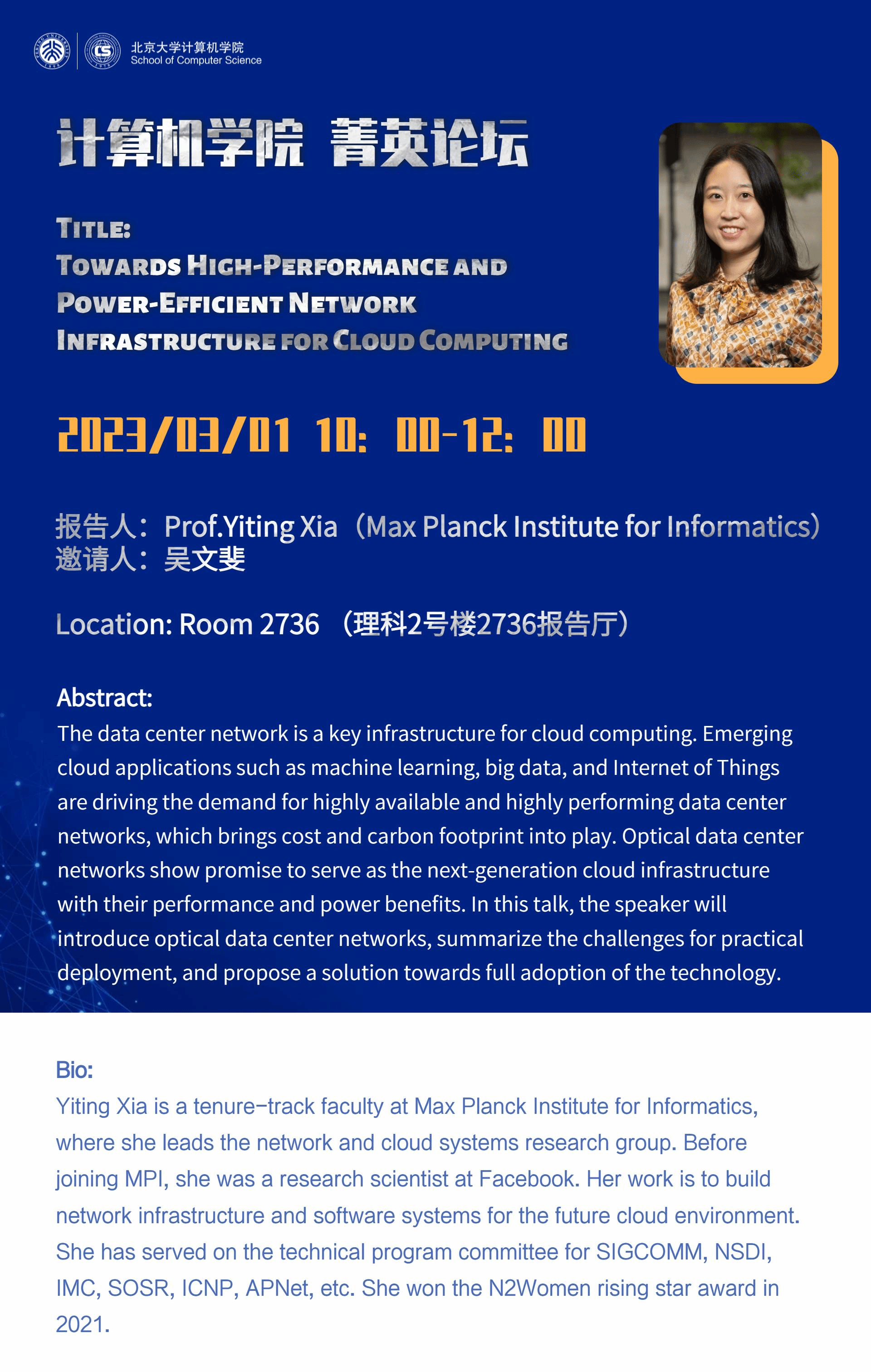 Yiting Xia is a tenure-track faculty at Max Planck Institute for Informatics, where she leads the network and cloud systems research group. Before joining MPI, she was a research scientist at Facebook. Her work is to build network infrastructure and software systems for the future cloud environment. She has served on the technical program committee for SIGCOMM, NSDI, IMC, SOSR, ICNP, APNet, etc. She won the N2Women rising star award in 2021.