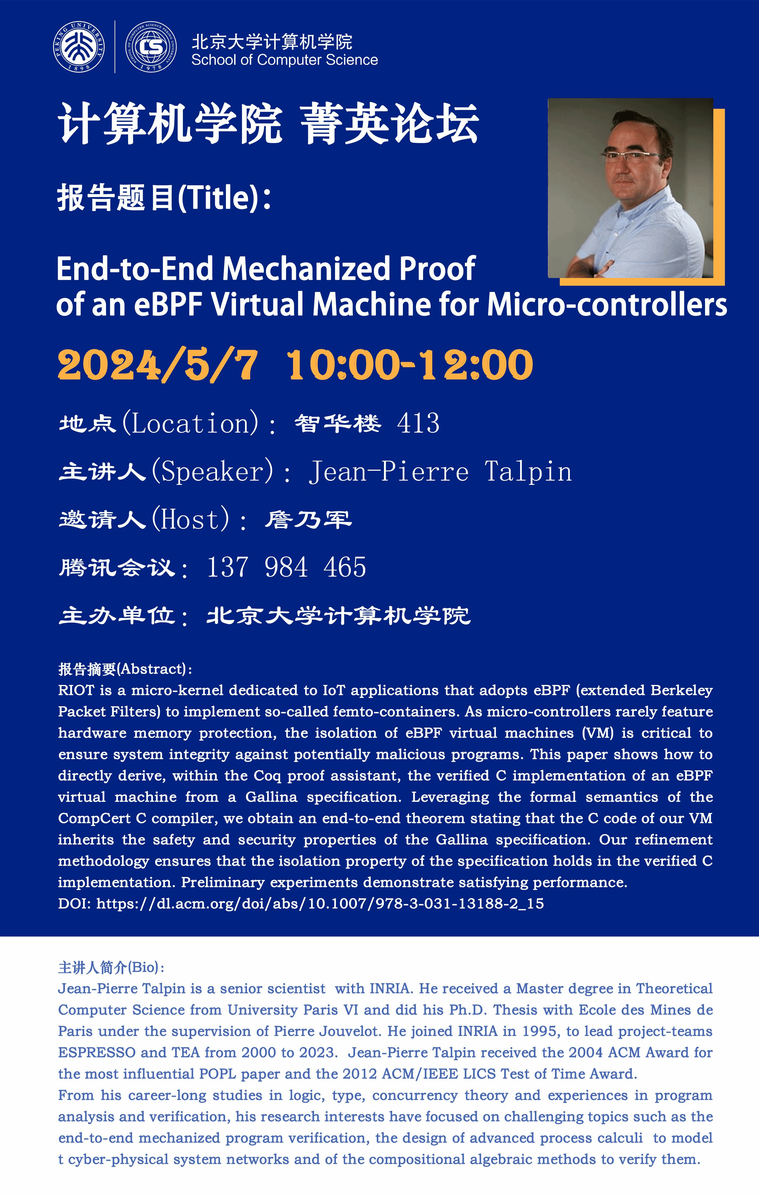 计算机学院系列讲座菁英论坛28期——End-to-End Mechanized Proof of an eBPF Virtual Machine for Micro-controllers