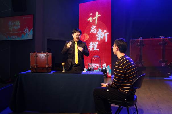 接下来的魔术表演将观众置身于一个充满奇迹和惊喜的世界,校友辛冠杰用他的纸牌和硬币魔术征服了全场的观众,他用熟稔的手法让纸牌在手中变幻莫测,银币眨眼间变成了中国古币,引来现场的阵阵惊呼和热烈掌声。在节目的最后,魔术师以纸牌为载体变幻出“龙舞代码,计启新程”的晚会主题,祝愿师生在新的一年收获满满。
