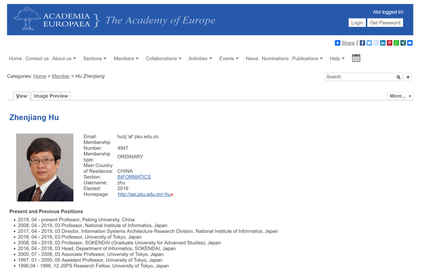 On June 27, 2019, Academia Europaea announced the results of the 2019 academician election. Hu, Zhenjiang, the Head of Department of Computer Science and Technology, Deputy Dean of School of Electronics Engineering and Computer Science, Peking University, is elected as a foreign academician.