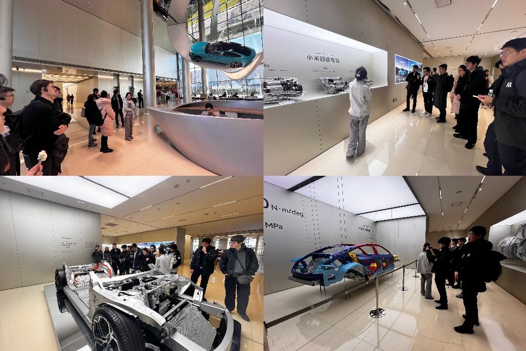 The visit began at the Xiaomi Auto showroom, where several of the company’s latest models were on display, showcasing advancements in vehicle design, power systems, and intelligent technologies. The guide provided an overview of the vehicle chassis structure, body framework, safety features, power performance, and the electronic and electrical architecture, highlighting Xiaomi’s self-developed platform and its strengths in lightweight design, energy management, and intelligent driving. A brief demonstration of the in-car intelligent system was also given, and its user-friendly interaction and ecosystem integration left a positive impression on the students. After the introduction, the students explored various Xiaomi models through test seating, gaining a close-up experience of the cockpit layout and the vehicle’s intelligent interaction features.