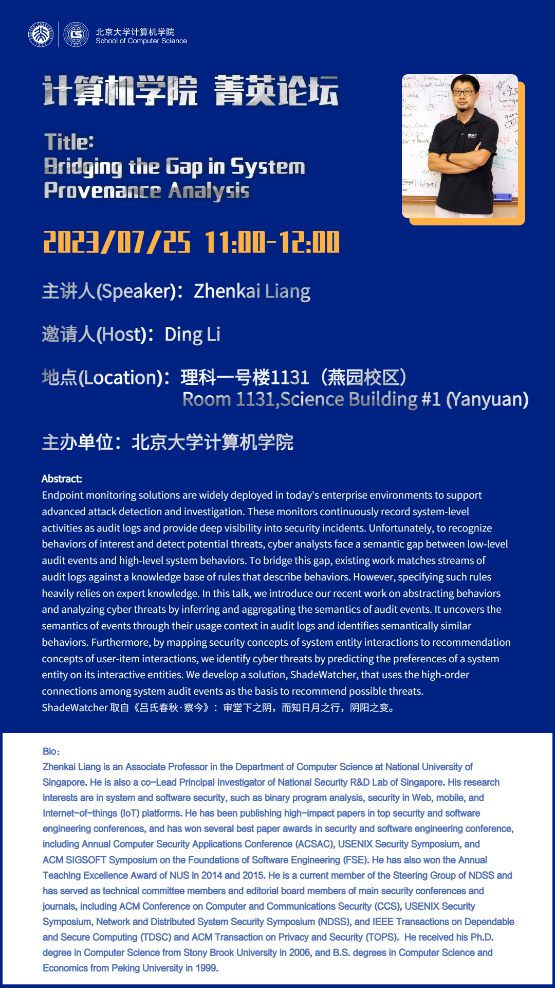计算机学院系列讲座 菁英论坛第13期——Bridging the Gap in System Provenance Analysis