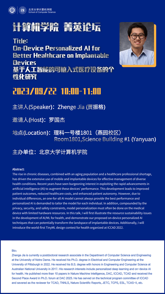 Zhenge Jia is currently a postdoctoral research associate in the Department of Computer Science and Engineering at the University of Notre Dame. He received his Ph.D. degree in Electrical and Computer Engineering at the University of Pittsburgh in 2022. He received his B.S. degree with honors in Engineering and Computer Science at Australian National University in 2017. His research interests include personalized deep learning and on-device AI for health. He published more than 10 papers in Nature Machine Intelligence, DAC, ICCAD, TCAD and received the Second Place Award in Ph.D. forum at DAC 2023. He has served on the technical program committee of ICCAD and severed as the reviewer for TCAD, TNNLS, Nature Scientific Reports, JETC, TCPS, ESL, TCAS-II, etc.