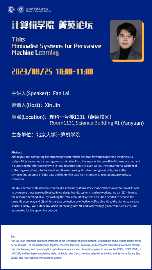 Fan Lai is an incoming assistant professor at the University of Illinois Urbana-Champaign and a visiting faculty member at Google. His research brings together machine learning, systems, and computer networking to enable efficient machine learning and data analytics up to the planetary scale. His work appears in venues like OSDI, NSDI, ICML, and ICLR, and has been adopted by Meta, LinkedIn, and Cisco. He was selected as the ML and Systems Rising Star (2023) and has received two awarded papers.