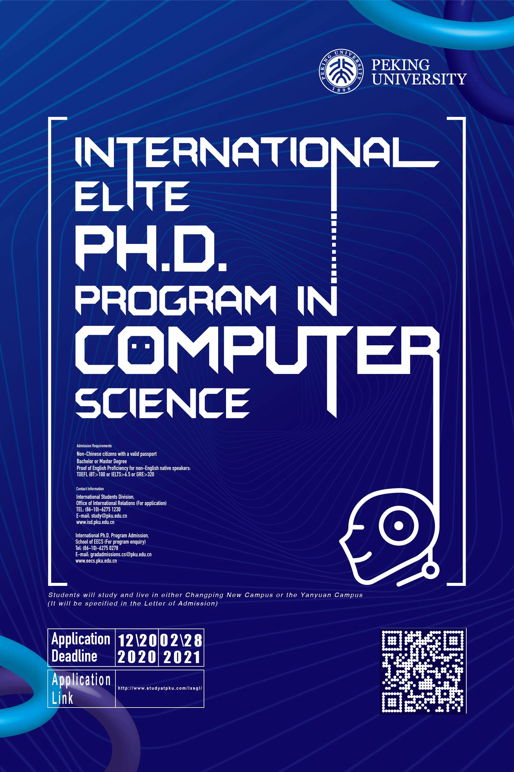 The International Elite Ph.D. Program in the Department of Computer Science and Technology at Peking University is an English-based program oriented to non-Chinese students. It aims at educating and advancing talented young scholars for high-quality research in the field of computer science. This program lasts 5 years for applicants with Bachelor's Degree and 4 years with Master's Degree. It involves coursework, independent research, and dissertation. This program enrolls approximately 10-20 overseas students annually.