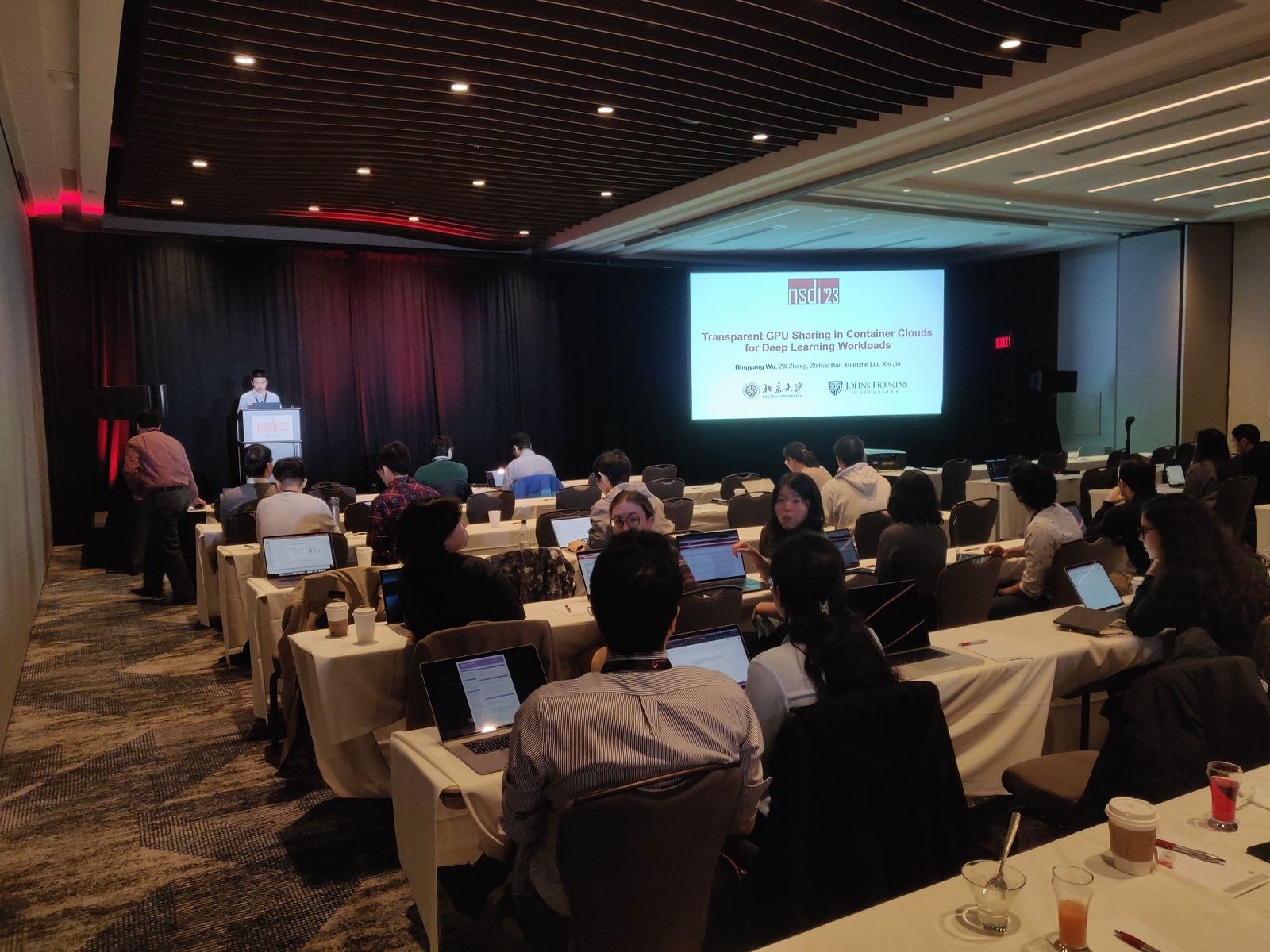 该工作以《Transparent GPU Sharing in Container Clouds for Deep Learning Workloads》为题,发表于今年 NSDI 的 Learning with GPUs 会场,由文章第一作者北京大学计算机学院22级博士生吴秉阳做口头报告,合作作者包括章梓立、白志豪(约翰斯·霍普金斯大学)、刘譞哲副教授、金鑫副教授(通讯作者)。