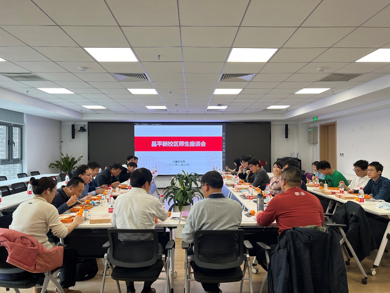 11月28日中午,计算机学院在新校区计算机大楼109会议室举办计算机学院师生座谈会,昌平新校区管理委员会办公室主任李航、保卫部副部长廖万平、基建工程部副部长王苏颖、校医院大夫王跃、馨园食堂经理周胜利受邀参加,计算机学院党委书记熊校良、党委副书记魏朋以及近二十名学生代表参加座谈会。计算机学院院长胡振江主持座谈会。