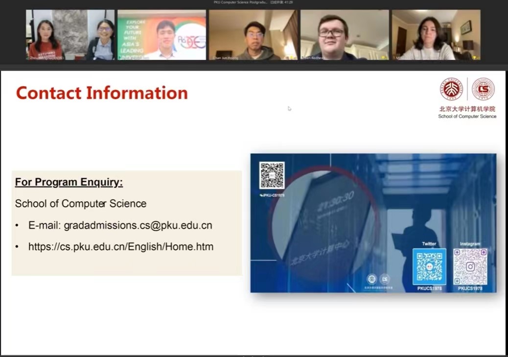 10月8日晚19:30-20:20,首先由计算机学院院长助理周明辉教授向大家介绍了学院的发展史、机构设置、国际影响力、留学生项目,杨舒向大家介绍了具体硕博项目申请流程。