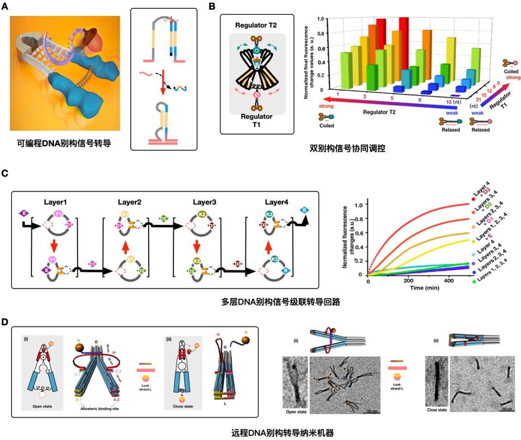 图1. (A) 可编程DNA别构转导基本模型;(B)双位点别构信号调控;(C)四层级联DNA别构信号回路;(D)远程DNA别构信号转导纳米机器。