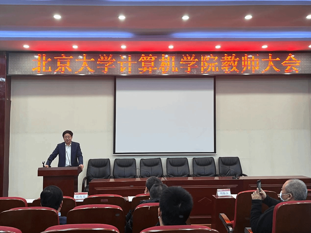 2022年1月10日,北京大学计算机学院在理科2号楼召开教师大会,北京大学党委常委、副校长张平文院士,党委组织部副部长刘雨龙以及计算机学院部分教职工参加大会。刘雨龙宣读了《关于成立中共北京大学计算机学院委员会的通知》,宣布了胡振江、熊校良和魏朋同志的任职决定,并对相关选拔任命工作进行了说明。计算机学院院长胡振江、党委书记熊校良、副书记魏朋依次进行任职发言,张平文副校长最后做了总结讲话。