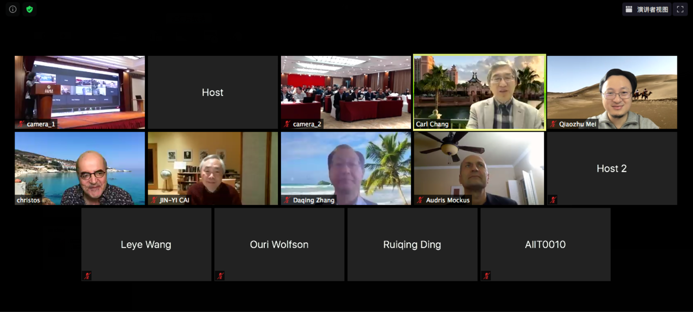 首先,高可信软件技术教育部重点实验室常务副主任金芝教授主持开幕,并请高可信软件技术教育部重点实验室主任梅宏院士、高可信软件技术学科引智基地(简称111计划)学术大师Carl Chang教授、高可信软件技术学科引智基地中方负责人谢冰教授致欢迎辞。梅宏院士总结2020年111计划取得的一系列成绩,感谢众多海外专家过去的付出,展望未来提出三点期望。张可昭教授回顾了2020年和基地共同举办的国际服务大会等重要成绩。谢冰教授向外国专家介绍了2020年重点实验室新引进的三位成员。
