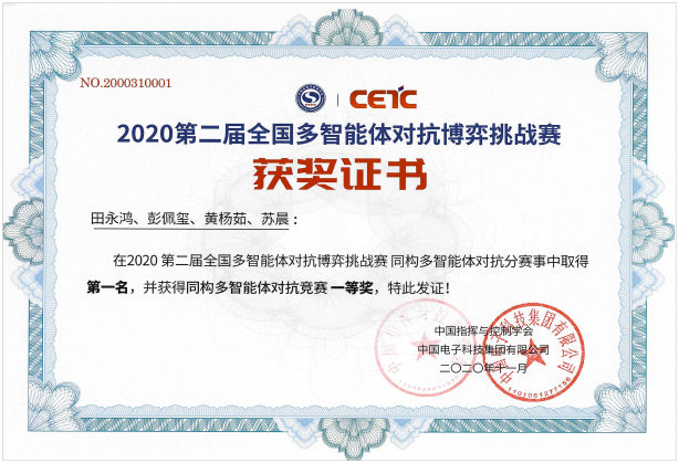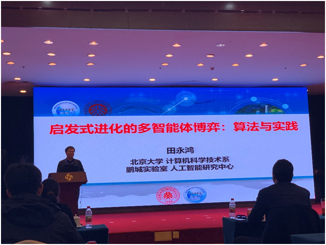 2020年11月15日下午,由中国指挥控制学会和中国电子科技集团有限公司共同主办的全国性赛事“2020第二届全国多智能体对抗博弈挑战赛”(简称挑战赛)在北京举办颁奖典礼,由北京大学与鹏城实验室的联合团队获得同构系列赛第一名,团队负责人为北京大学信息学院计算机科学技术系的田永鸿教授,主要成员包括北京大学信息学院的彭佩玺副研究员以及黄杨茹和苏晨两位在读研究生。田永鸿教授在颁奖典礼上做了题为“启发式进化的多智能体博弈:算法与实践”的报告,探讨了强化学习和对抗博弈领域中的一些前沿问题,分享了团队在启发式进化学习问题上的最新研发成果。