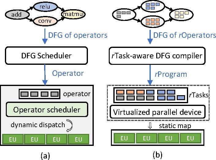 在前一篇论文中,杨智及其指导的博士研究生马林霄(第一作者)与微软的研发人员设计了一种新的深度学习编译系统Rammer,如图1所示,该系统改变了目前深度学习框架的系统结构,通过细粒度的计算抽象和编译,实现高效的深度学习计算加速,比目前流行的TVM、XLA深度学习编译器高达20倍以上的加速。