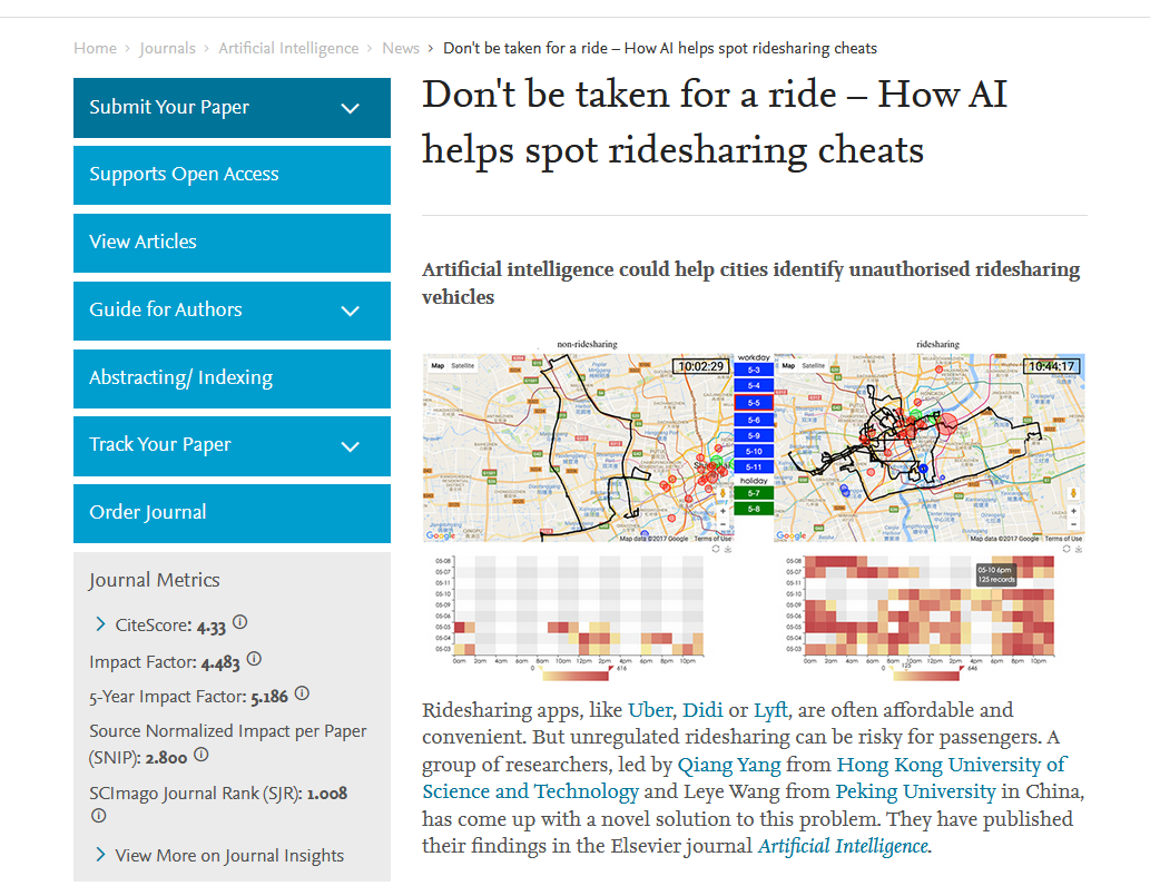 北京大学王乐业助理教授作为第一作者的基于迁移学习识别网约车的论文《Ridesharing Car Detection by Transfer Learning》于2019年被具有50年历史的人工智能领域顶级期刊、CCF A类《Artificial Intelligence》录用,同时被该刊新闻频道(News)特约报道。《Artificial Intelligence》新闻频道每年仅精选少量录用论文进行特约报道(2018年1篇,2019年截至11月2篇)。《Ridesharing Car Detection by Transfer Learning》为国内首次被《Artificial Intelligence》新闻频道特约报道的论文。该论文合作者包括北京大学张大庆教授,香港科技大学杨强教授、麻晓娟助理教授及博士生耿栩。