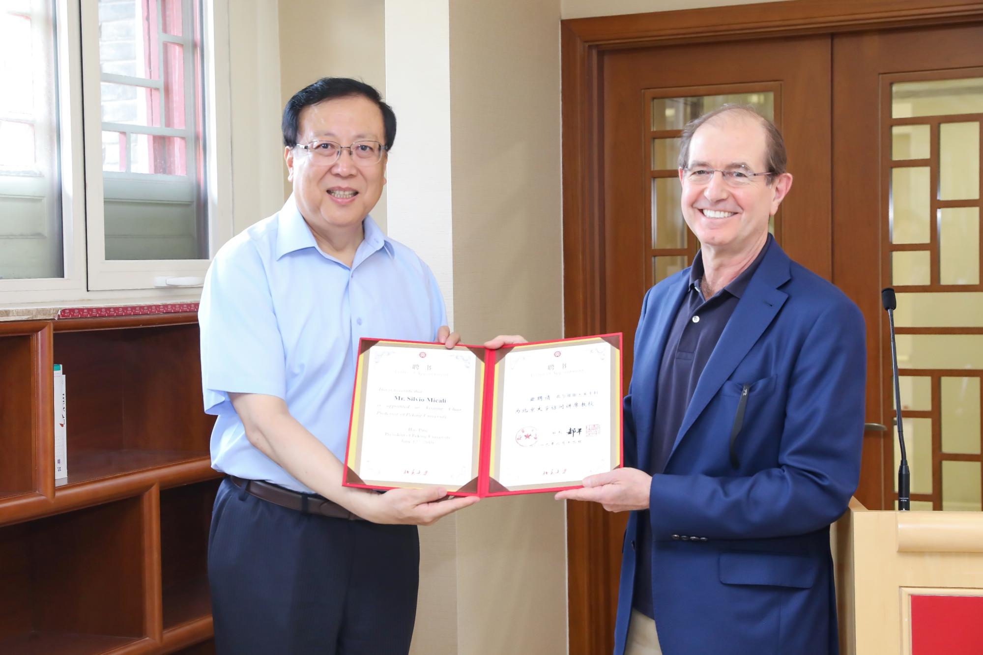 在现场师生的热烈掌声中,郝平校长为米卡利教授颁发了北京大学访问讲席教授的聘书。米卡利教授在获聘感言中表示,科学无国界,我们应该加强合作,共同发展。他将在学校的支持下,努力在青年教师指导、学生培养等方面提供帮助,与北京大学保持紧密良好的合作关系,并对在场的同学们寄予殷切期望,勉励大家在科学的道路上继续努力,勇攀高峰。