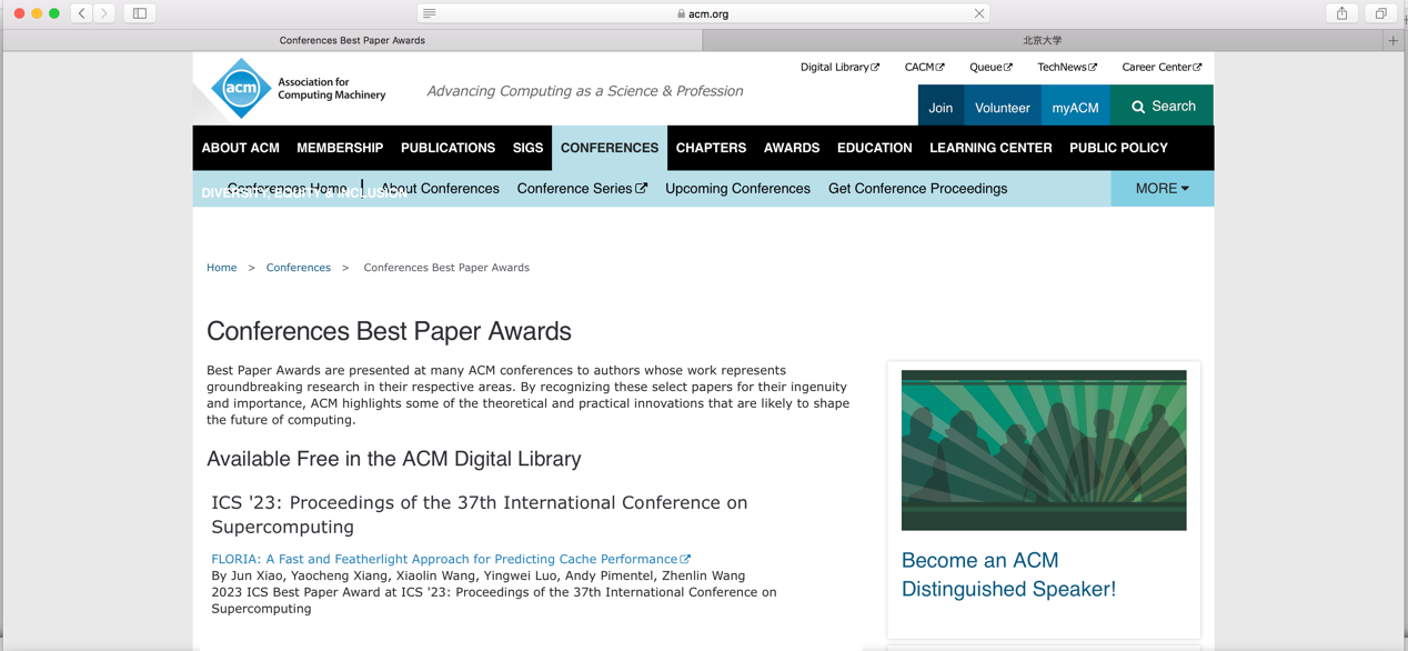 北京大学计算机学院罗英伟教授、汪小林教授团队近年来在计算机系统结构领域,围绕缓存性能分析和资源管理等方向开展了一系列深入研究。最新成果以题为《FLROIA:一种快速、轻量的缓存性能预测方法》(FLORIA: A Fast and Featherlight Approach for Predicting Cache Performance)的论文发表在高性能计算领域的旗舰会议之一——2023年国际超级计算会议(2023 ACM International Conference on Supercomputing, ACM ICS 2023)上,并荣获会议唯一最佳论文奖(https://www.acm.org/conferences/best-paper-awards)。