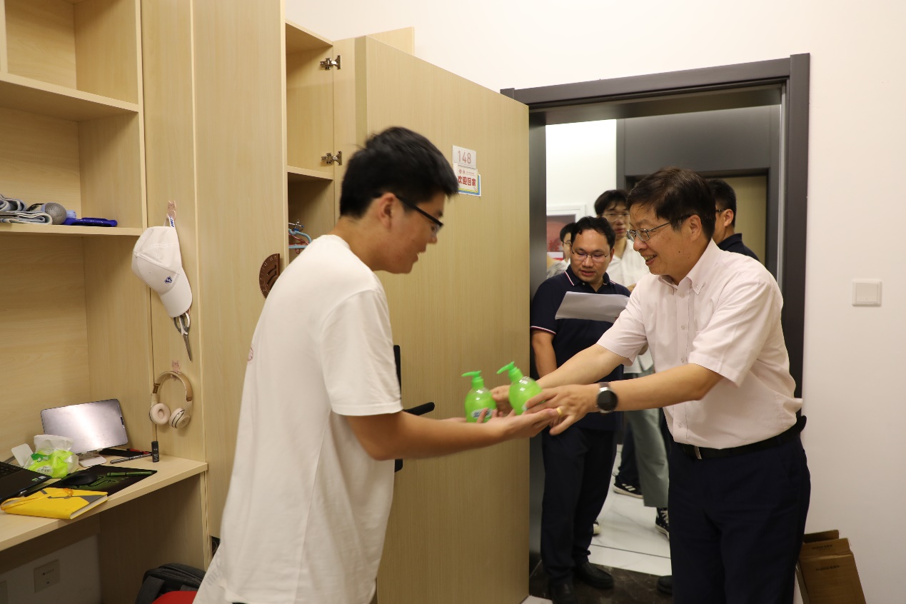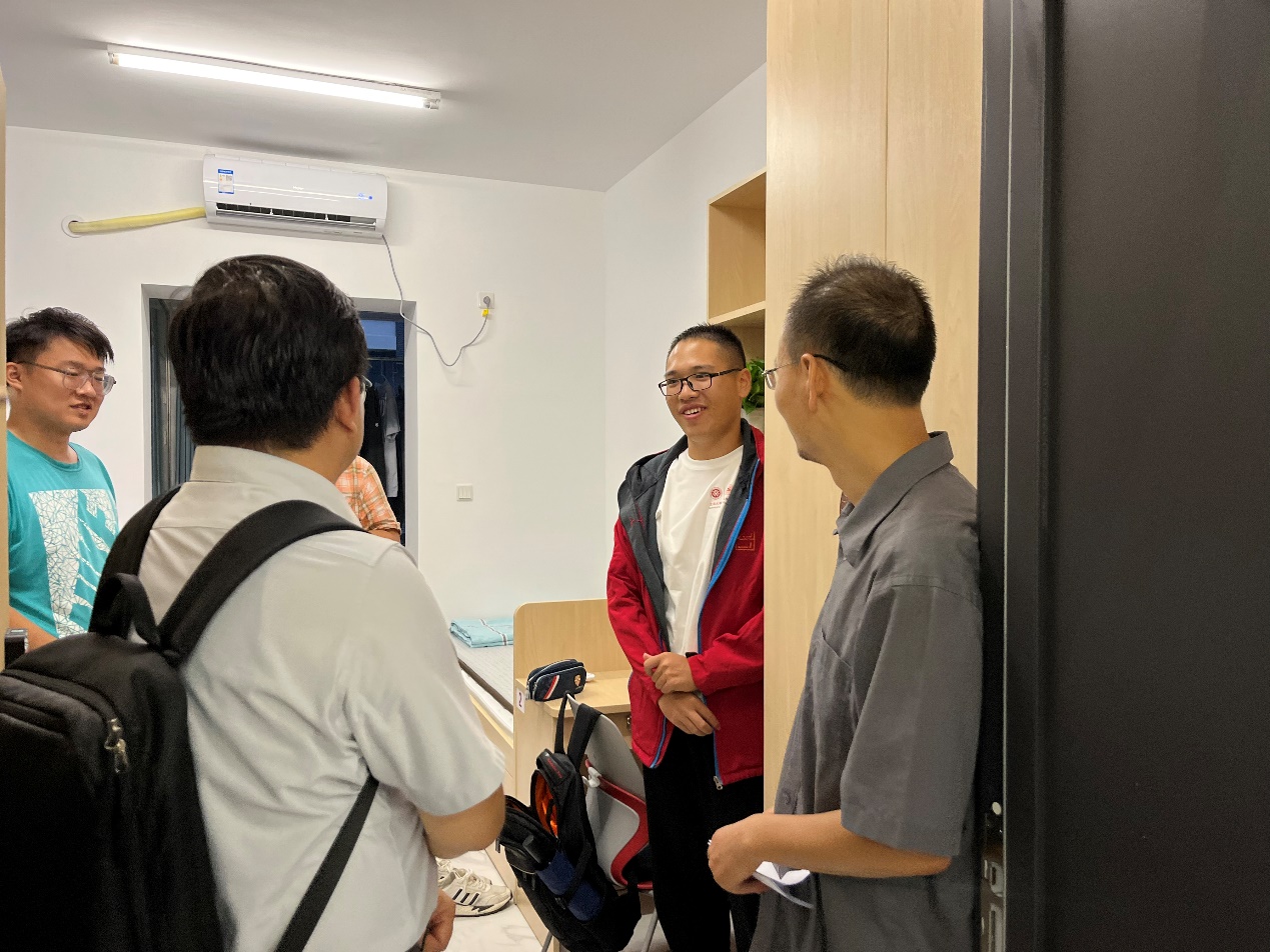 在计算机大楼集结完毕后,老师们一同前往学生公寓。抵达学生公寓2号楼和5号楼后,老师们分组进入了学生宿舍,向新生们赠送了学院准备的小礼物,共同为刚刚入住新校区的学子们送上了关怀与祝福。
