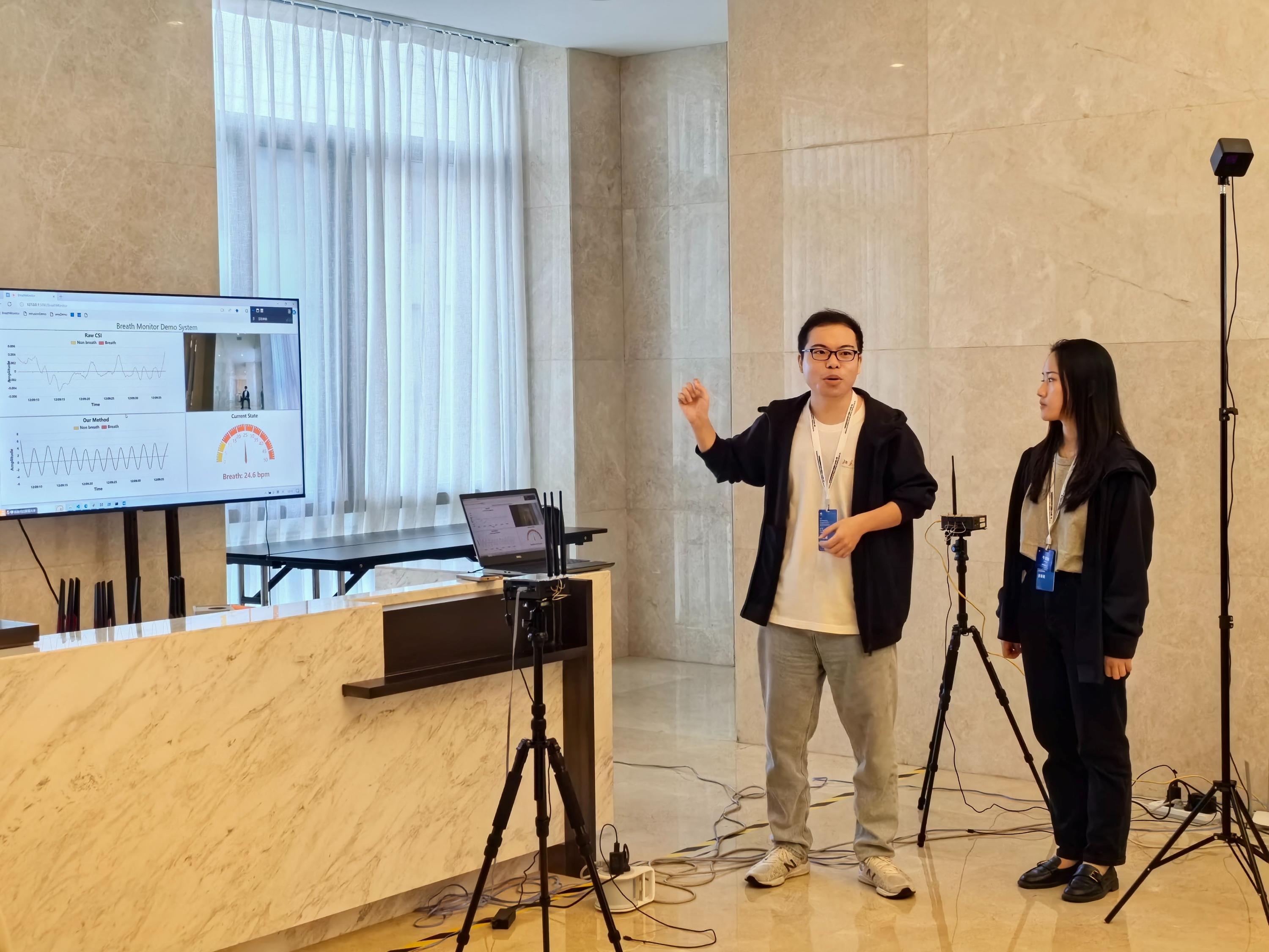 WiS队(博士生李洋-队长,博士生刘锦怡和本科生陈嘉何)在赛道二提出的方案是《NLoS场景下基于商用WiFi设备的感知范围扩大技术》。尽管人们对基于WiFi感知的许多应用进行了探索,但是多个挑战使得WiFi感知应用仍无法大范围落地商用。以呼吸监测为例,现有的系统只能使用特定网卡,在收发端可见、感知目标到设备比较近的情况下才能检测到呼吸。然而,真实场景下,我们希望可以利用多种商用设备,在收发端不可见、目标距离设备比较远或者收发设备相距比较远的情况下仍能检测呼吸。为此,WiS队提出了利用时域、频域、空域信息提高信噪比和感知范围的通用方法,可将现Wi-Fi感知范围提高3倍,远远超过目前最优的呼吸感知系统性能。