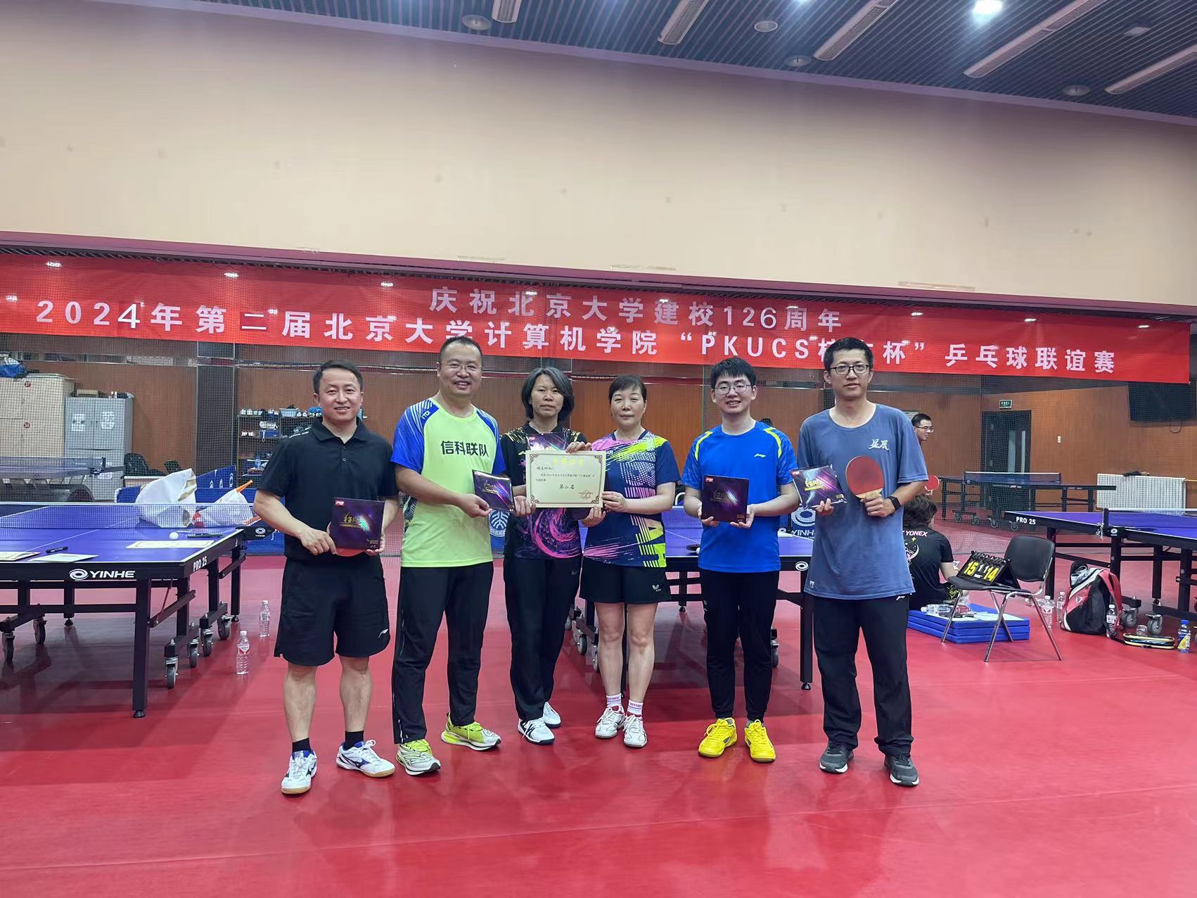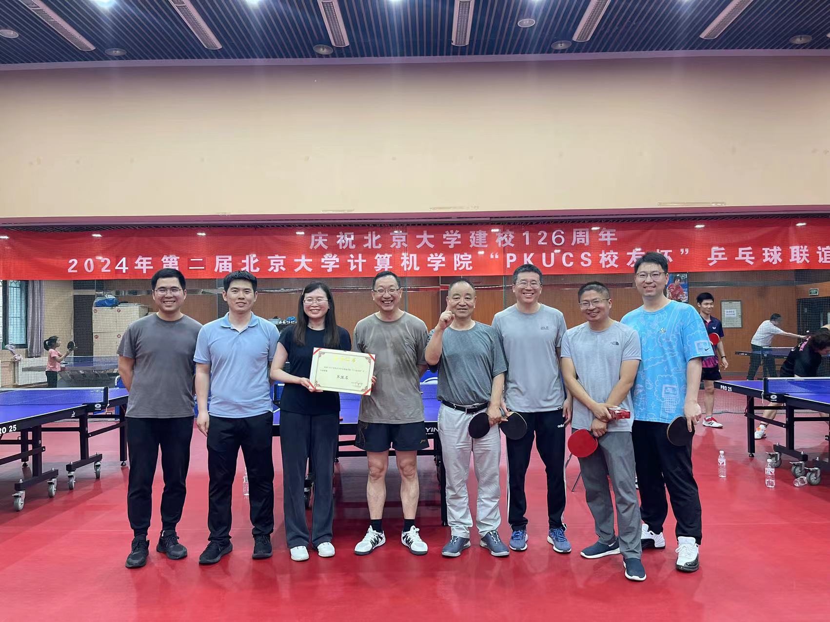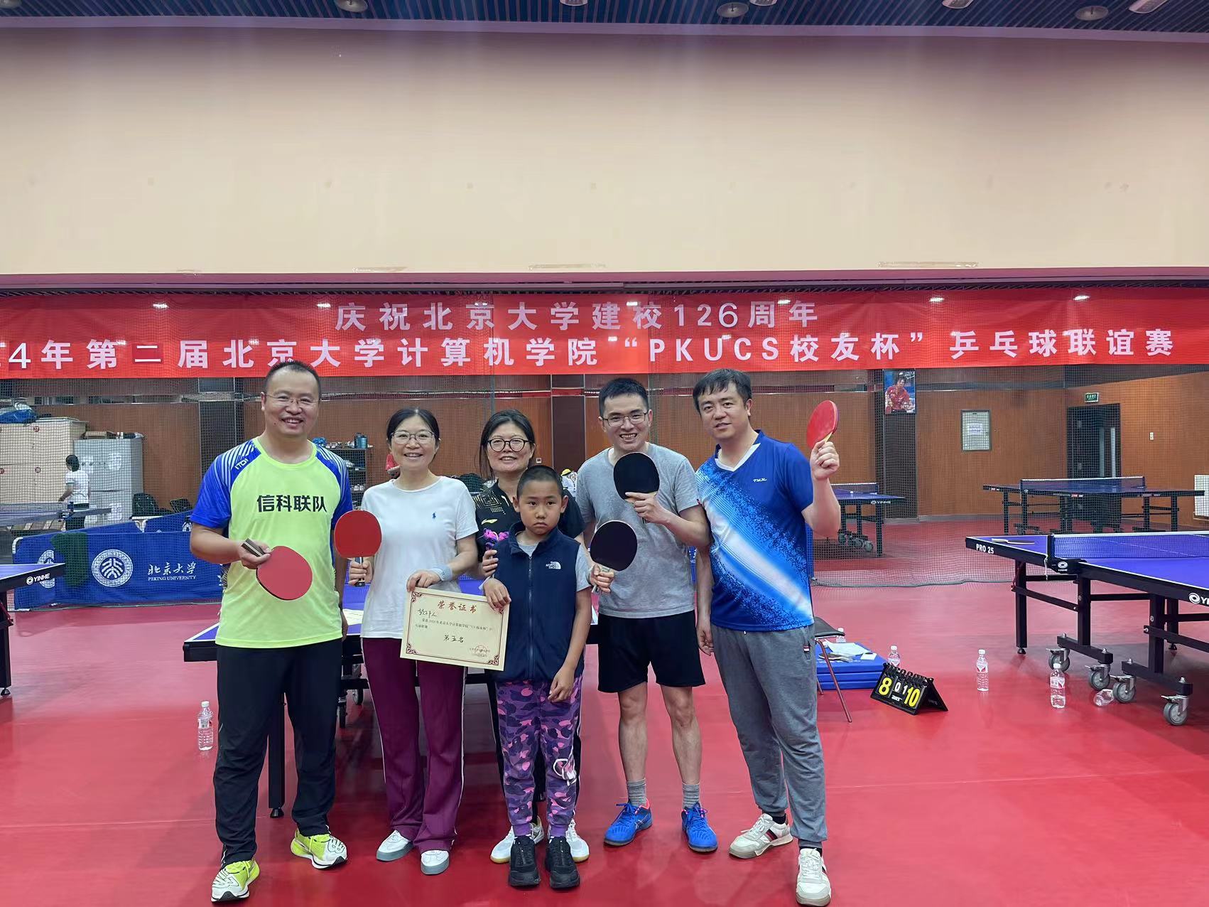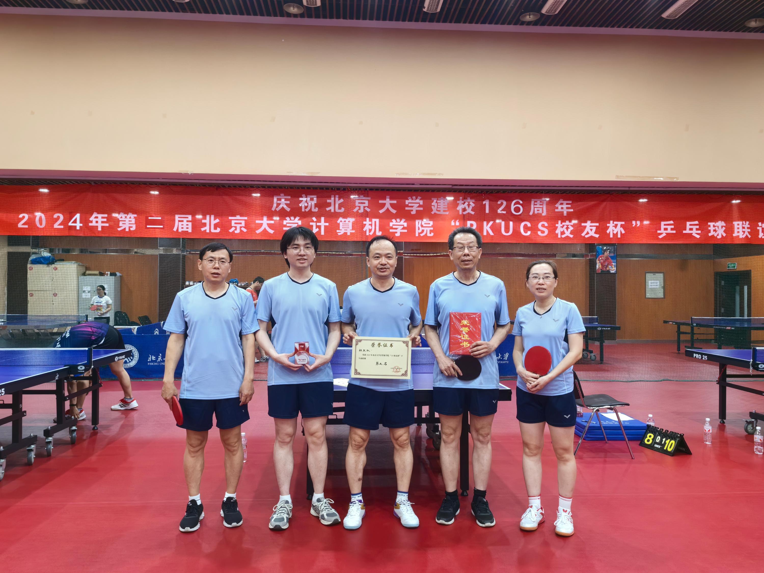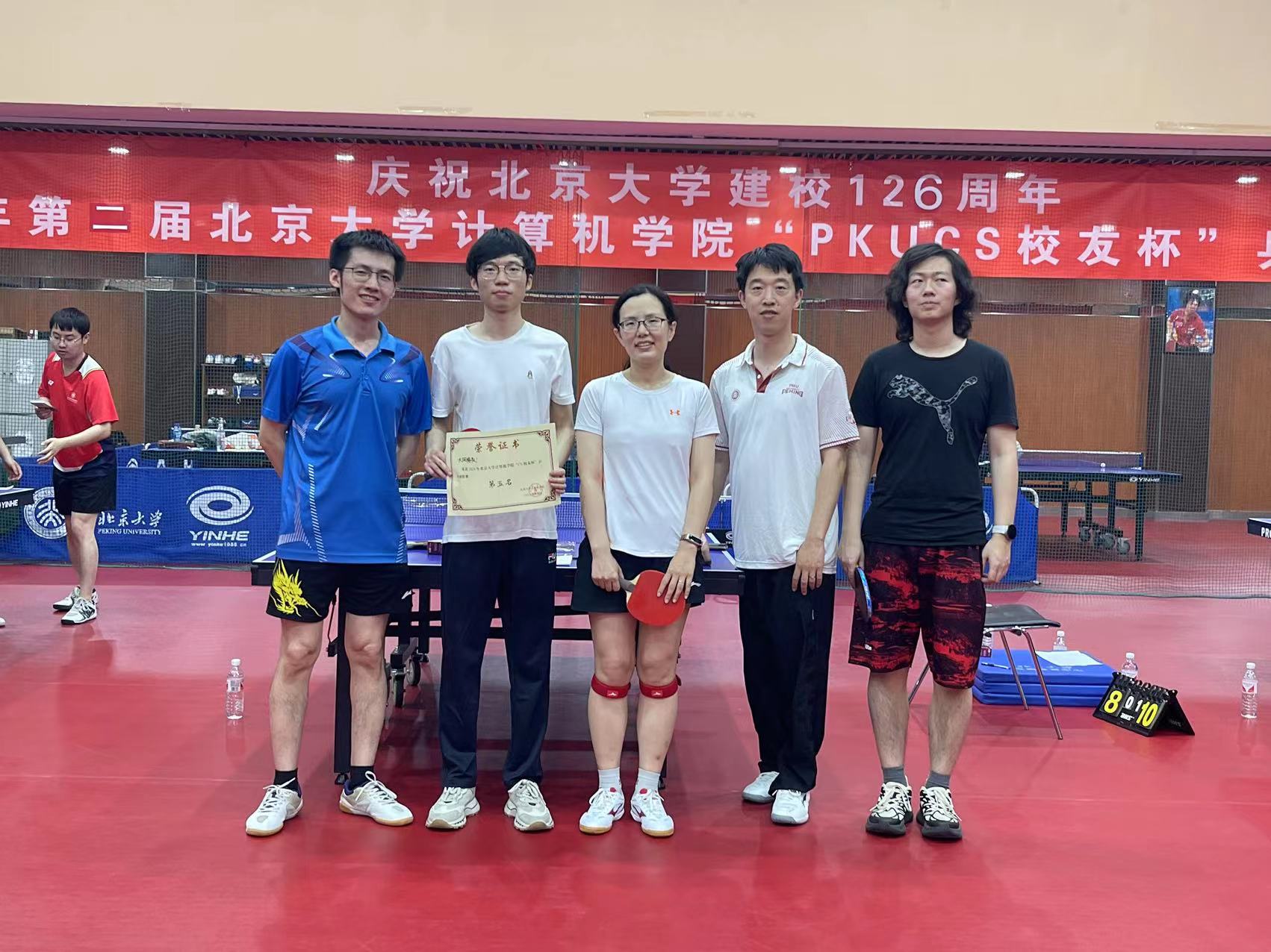 校友队:我们的队伍是由五名散报选手组成。虽然来自于不同的课题组,但是我们很快在球场上找到了“默契”,并且为了凝聚团队力量、为比赛助威,杨涛队长为队伍准备了统一的队服,我们迅速形成了一支“有组织”的球队。比赛中,杨涛队长更是发挥了“稳定军心”的作用,在男单比赛中发挥极其稳定,攻球、搓球等攻防转换的节奏“拿捏”相当到位;雷老师与来自北大乒协的选手对战中也表现相当英勇,将比分咬得很紧,发挥非常出色。这次比赛不仅让来自各个岗位的校友能够享受到比赛的快乐,更重要的是加深了我们与学校的联系,其实大家一直都很想念母校,想念曾经共同成长过、奋斗过的计算机学院,希望计算机学院越来越好,也祝愿明年我们能够再创辉煌!