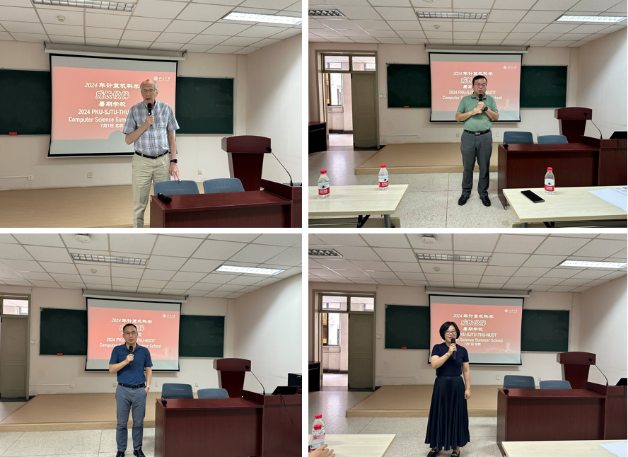 John Hopcroft结合自身经历分享了关于教育的意义、关于历史性变革的启示,并鼓励各位同学要发现兴趣、追寻热爱,在不断变化的世界中面向未来,拥抱更好的生活。郭耀代表北大计算机学院对各位同学、老师的到来表示热烈欢迎,希望通过此次夏令营活动推进不同高校间师生的交流合作,也希望各位同学能够志存高远,真正成为具有创新能力和社会责任感的计算机领域拔尖人才。谭郁松表示,国防科技大学很荣幸受邀参与本次暑期交流学习活动,希望各位同学能够珍惜学习机会,认真学习前沿知识,增强对计算机科学的理解与热爱,努力成为推动计算机科学进步的开拓者与创造者。陈娟希望国内顶尖高校的优秀学生能够跨越学校、学科的边界,互相交流、互相学习、互相合作,共建拔尖人才培养的新高度。
