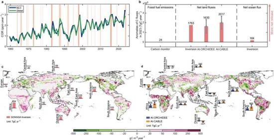 2023年全球碳收支异常分析。 (a) 1959—2023年大气CO2年增长量。 (b) 2023年化石燃料燃烧碳排放、陆地净碳通量、海洋净碳通量相较于2022年的变化。 (c—d) 大气反演系统(c)以及基于生态过程的人工智能碳汇预测模型(d)估计的2023年陆地净碳通量异常。b—d中正值表示更多的碳释放到大气中