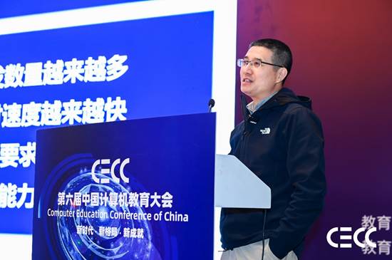 大会报告环节,“计算概论”课程负责人、哈尔滨工业大学教授战德臣作题为“101计划实践类课程建设方法与案例——以计算思维程序实践课程建设为例”的报告。报告围绕计算思维教育、计算思维程序实践、“K+M+N”协同教学模式建设三方面,介绍了程序设计类课程通过项目实践和项目研讨方式,促进学生计算思维、人工智能思维与各专业思维交叉融合,同时基于MOOP平台,建立协同建课(师)、协同开课(校)、协同创作(生)的实践教学体系,为各专业学生今后设计、构造和应用各种计算与智能系统求解学科问题奠定程序实现基础。