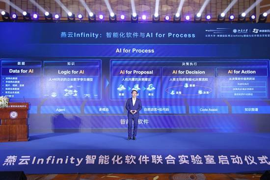 神州控股董事局主席郭为在致辞中回顾了与北京大学长达20年的产学研合作历程。从最初的探索,再到荣获国家技术发明奖一等奖,双方始终以“突破中国数字化核心技术”为使命。郭为强调,联合实验室的成立不仅是技术合作的延续,更是产学研深度融合的范式创新——通过“燕云Infinity”,将AI大模型与产业流程深度结合,致力于解决通用大模型商业化落地的全球性难题。郭为呼吁,让智能化软件技术从实验室真正走向千行百业,为中国乃至全球产业发展贡献力量。