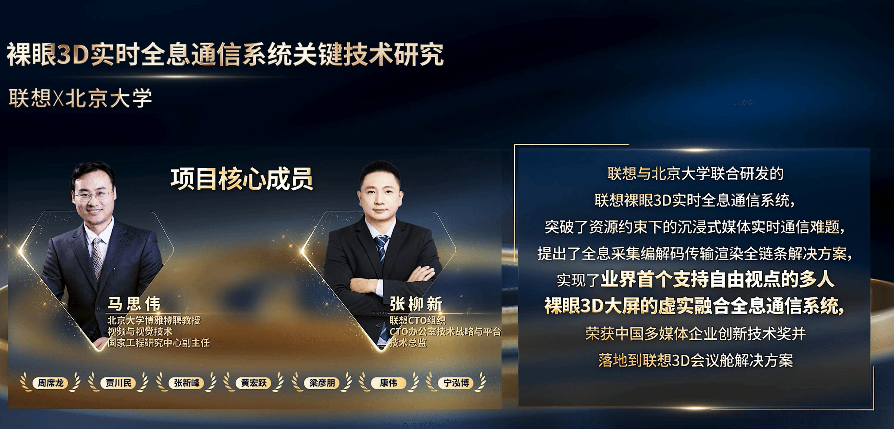 马思伟团队长期深耕多媒体通信技术,此次获奖的“联想裸眼3D实时全息通信系统” 提出了全息采集、编解码、传输、渲染全链条解决方案,实现了业界首个支持自由视点的多人裸眼3D大屏虚实融合通信。简单来说,这套系统能让用户在无需佩戴设备的情况下,通过大屏实现立体、沉浸式的远程沟通,解决了传统视频通信中空间感不足、设备依赖度高的问题。