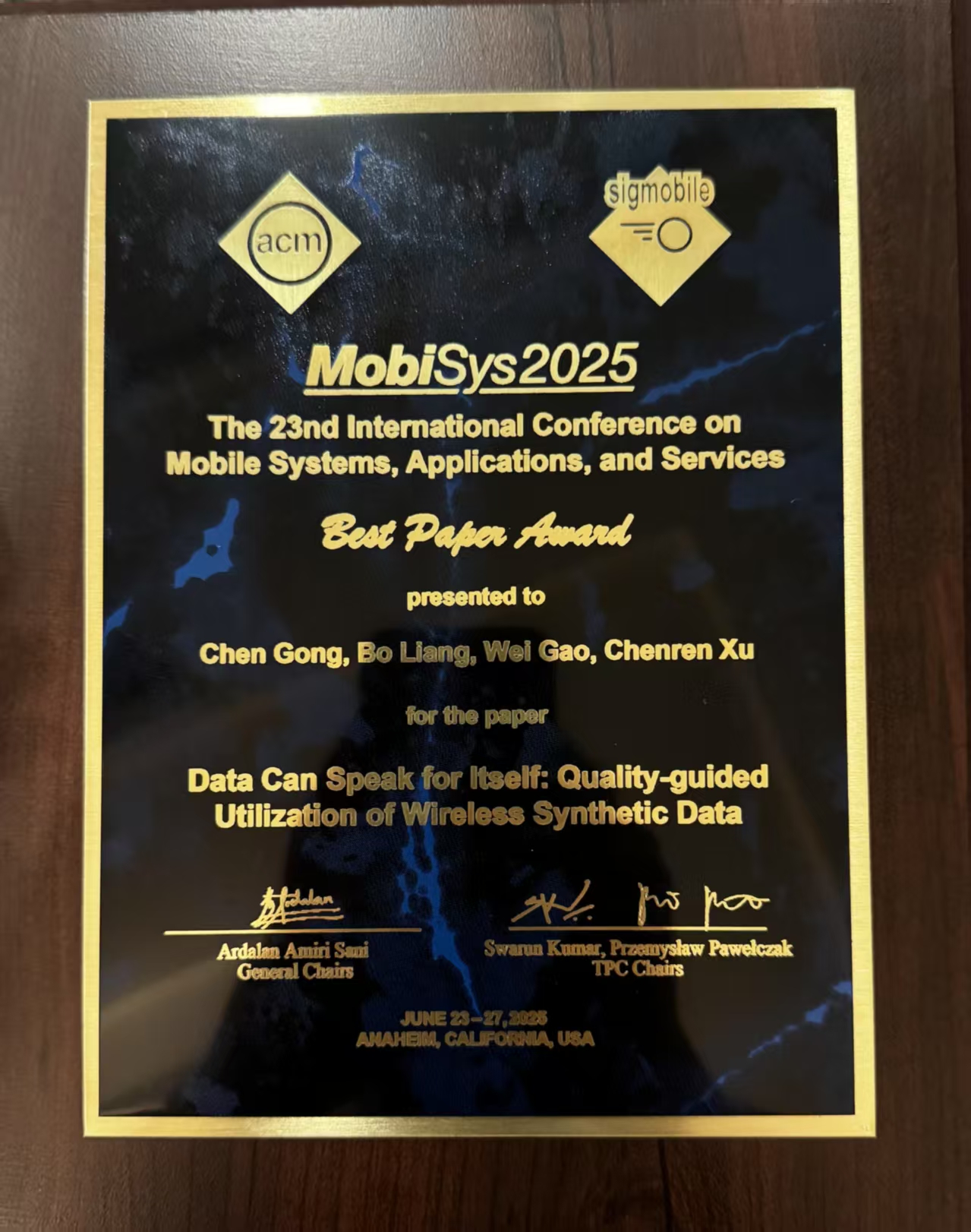 移动计算领域顶级会议MobiSys 2025近日在美国落下帷幕,北京大学计算机学院许辰人长聘副教授团队的研究成果《Data Can Speak for Itself: Quality-guided Utilization of Wireless Synthetic Data》荣获大会最佳论文奖(Best Paper Award)。MobiSys由美国计算机协会(ACM)创办,是移动计算、移动应用和移动服务各个方面创新和重要研究的领域旗舰会议,入选CSRankings和CCF-B类列表。该会议旨在展示有关移动计算和无线系统、应用和服务的设计、实施、使用和评估的创新和重要研究,重视具有高影响力的技术贡献,以及现代移动系统的有效、可复制的实施和实际评估。