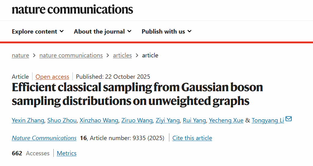 近日,北京大学计算机学院前沿计算研究中心助理教授李彤阳课题组在无权图上高斯玻色采样(Gaussian Boson Sampling, GBS)分布高效经典采样算法研究方面取得重要进展。研究团队提出了一种基于马尔可夫链蒙特卡洛(MCMC)的“双循环 Glauber 动力学”采样算法,在理论上首次证明该算法可在多项式时间内高效生成与量子玻色采样分布一致的样本。相关成果以《无权图上高斯玻色采样分布的高效经典采样》(“Efficient Classical Sampling from Gaussian Boson Sampling Distributions on Unweighted Graphs”)为题发表于国际知名期刊《自然-通讯》(Nature Communications)。