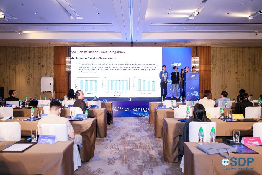 此外,由计算机学院博士生李文威、周家润、全秦霄、王俊喆和元培学院本科生谢昱辉组成的 PKU-WISE 团队(指导老师:张大庆教授,队长:李文威)亦在决赛现场的激烈竞争中表现不凡,荣获大赛三等奖,赢取5000美元奖金。他们凭借首创的Wi-Fi CSI差分理论以及性能领先的微多普勒特征提取技术,在单个Wi-Fi链路上可获得实时、高精度的多普勒速度,进而实现了实时的“One-shot”(单样本)步态识别。