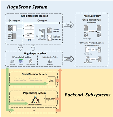 大页被广泛用于虚拟化环境以提升两级地址翻译效率。然而,激进地使用大页会导致页面热膨胀的问题,即对于一个倾斜访问部分小页区域的大页,hypervisor会错误地将其识别为一个高热度的大页。在非虚拟化环境下的分层内存管理场景已经有方案解决热膨胀问题,但是需要在准确性、性能和硬件修改三个方面进行权衡。事实上,在虚拟化环境中,热膨胀会对更多的应用场景产生性能和资源利用率的影响。针对此挑战,论文“Taming Hot Bloat Under Virtualization with HugeScope”提出了首个针对于虚拟化环境解决热膨胀的框架HugeScope。论文的核心思想是利用虚拟化带来的第二级地址空间稳定的特性,使得EPT极少被修改,并且总是通过稳定的软件接口进行访问。HugeScope通过1)利用不一致地拆分EPT页表页完成低开销、高准确率的小页粒度监控机制并在EPT的访问接口添加代码钩子保证安全,进而获得大页面中小页粒度的访问情况; 2)根据页面的frequency、recency和skewness抽象出系统的热页膨胀率,全面且动态地决策和调整页面的大小;3)提供一套模块化接口以支持不同的管理子系统。与现有的机制相比,HugeScope能够在分层内存场景带来61%的性能提升,在页面共享场景带来41%内存资源共享提升。该论文第一作者为计算机学院2021级博士生李传东(导师为汪小林、罗英伟教授),作者包括华为公司沙赛博士、北京大学曾洋卿同学、杨翕然同学、罗英伟教授、汪小林教授、密歇根理工大学王振林教授、EPFL/北京大学周迪宇助理教授。