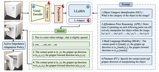 机器人操作依赖于准确预测接触点和末端执行器的方向,以确保操作成功。然而,基于学习的机器人操作如果仅在模拟器中针对有限类别进行训练,往往难以实现广泛的泛化,特别是在面对大量类别时。因此,CVPR 2024论文《ManipLLM: Embodied Multimodal Large Language Model for Object-Centric Robotic Manipulation》提出了一种创新的机器人操作方法,利用多模态大型语言模型(MLLMs)的强大推理能力来增强操作的稳定性和泛化能力。通过微调注入的适配器,保留了MLLMs固有的常识和推理能力,同时赋予它们操作的能力。关键在于引入的微调范式,涵盖了对象类别理解、可操纵(affordance)先验推理和以对象为中心的姿态预测,以激发MLLM在操作中的推理能力。在推理过程中,所提出方法利用RGB图像和文本提示以chain-of-thought的方式预测末端执行器的姿态。在建立初始接触后,引入了主动阻抗适应策略,以闭环方式规划接下来的路径点。此外,在现实世界中,设计了一种用于操作的测试时适应(TTA)策略,使模型能够更好地适应当前的实际场景配置。