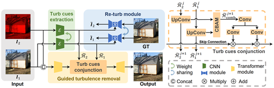 在远距离成像中,大气扰动的消除对于提升成像质量至关重要。由于图像内容和复杂的扰动场难以精确区分,现有基于单图输入的扰动消除方法在处理复杂扰动场景时遇到瓶颈。为解决这一问题,一些方法提出利用大气扰动的时变物理属性,基于多图输入进行扰动的消除。尽管此类方法通常在细节恢复能力和鲁棒性上表现较好,但其需要拍摄图像序列来获得足够的大气扰动消除约束,在实际应用中可能会带来不便。为解决真实场景中的大气扰动消除问题,CVPR 2024论文《NB-GTR: Narrow-Band Guided Turbulence Removal》提出了一种新的湍流去除网络。作者发现窄带图像的通带上累积扰动效应减少,可以为扰动消除过程带来强有力的约束,为此提出在传统的RGB图像下引入了额外的窄带图像的引导,仅需一对图像即可显著抑制大气扰动,从而增强了捕获场景的清晰度和真实性。该方法采用两步融合策略,首先利用再扰动模块有效地从一对RGB和窄带图像中联合提取扰动场信息,再据此有效引导扰动消除网络。利用窄带成像的优势,图像平面的湍流得到显著降低,从而能在不损失色彩信息的同时减少高频细节的丢失。实验结果表明,该方法在保持单图扰动消除方法的便利性的同时,能够产生更真实的结果。