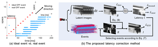 在低光场景下,基于事件相机的去模糊和插帧算法在建模中均需要假设理想的事件触发模型,即事件检测时间与实际变化发生时间一致。在低光场景下,真实事件模型与理想事件模型存在较大的偏差,导致去模糊和插帧算法的建模不够准确,极大影响了这些算法的性能。目前尚不存在事件相机的延迟矫正算法,因此低光下基于事件相机的去模糊和插帧算法的退化问题未能被充分考虑。针对上述问题,CVPR 2024论文《Latency Correction for Event-guided Deblurring and Frame Interpolation》提出了基于事件的时序置信度指标,用于评估去模糊后图像的清晰程度,判断去模糊算法的效果;该论文还提出了一个基于延迟与强度值的曲线,建模了延迟与模糊图像强度值的关系;基于时序置信度指标、事件积分的可导表达及上述曲线,该论文实现了数据驱动的事件延迟矫正。实验结果表明,该论文提出的方法能够校正事件相机的延迟,在一定程度上解决低光下基于事件相机的去模糊和插帧算法的退化问题。