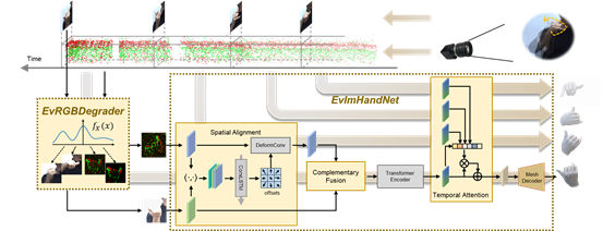 手势姿态估计是一个经典的计算机视觉问题,在人机交互、虚拟现实和机器人领域中有重要应用,一个实用的手势姿态估计算法需要做到鲁棒性和泛化性强、延迟和功耗低。当前的手势姿态估计方法主要是基于RGB或者RGB-D相机,RGB相机的成像具备丰富的颜色和纹理信息,但是面临着信息冗余、成像延迟,在挑战性场景下图像质量的退化(过曝或者运动模糊)等问题。而事件相机的异步成像机制使其具备高动态范围、低延迟,低数据冗余度等特征,但同时也存在数据稀疏纹理缺失的问题。针对这些问题,CVPR 2024论文《Complementing Event Streams and RGB Frames for Hand Mesh Reconstruction》提出利用事件相机和RGB相机成像的互补性,融合两种模态数据进行手势姿态估计。数据方面,本工作根据两种相机的成像特性,提出了一种成像退化的数据增广方式,使得训练时只需要正常场景的数据,就可以泛化到挑战性场景上;模型方面,本工作精心设计空间对齐、互补融合、以及时序注意力模块,将两种模态对齐。实验结果表明,该方法效果优于基于单个传感器的方法,只需要常规场景的训练数据,就可以泛化到各种挑战性场景。