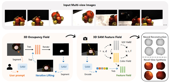 多视角图像的神经三维重建最近引起了越来越多的关注,现有方法通常学习整个场景的神经场,而如何重建用户指定的目标对象仍然是一个未充分探索的问题。考虑到分割一切模型(SAM)在分割任何二维图像方面显示出的有效性,CVPR 2024论文《NTO3D: Neural Target Object 3D Reconstruction with Segment Anything》提出了一种新颖的高质量神经目标对象三维重建方法NTO3D,该方法利用了神经场和分割一切模型的优势。该方法首先提出一种新策略,将分割一切模型的多视角二维分割掩模提升到一个统一的三维占用场。然后,三维占用场被投影到二维空间并生成分割一切模型的新提示。这一过程是迭代的,直到收敛,以将目标对象从场景中分离出来。之后,将分割一切模型编码器的二维特征提升到三维特征场中,以提高目标对象的重建质量。NTO3D将分割一切模型的二维掩模和特征提升到三维神经场,用于高质量的神经目标对象三维重建。本文在几个基准数据DTU、LLFF、BlendedMVS上进行了详细的实验,以展示所提出方法的优势。