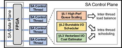 块存储是云计算的重要组成部分。目前,通过DPU(data processing unit)对存储进行虚拟化以及支持块存储进行突发已经成为块存储产品的常见做法。通过对阿里云块存储系统的观察与测量,我们发现运行在DPU上的存储虚拟化软件是多租户块存储性能波动的主要来源。我们进一步发现,块存储对突发I/O的支持进一步加剧了租户间的性能扰动。为了解决这一问题,论文《Burstable Cloud Block Storage with Data Processing Units》提出了支持突发、软硬件协同优化的I/O调度系统BurstCBS。BurstCBS充分利用DPU上的FPGA实现了多个线程间的负载均衡,并在每个线程上对租户可获得的资源进行合理分配。具体来说,BurstCBS采用了三个思路:(一)通过高性能的队列扩展技术在不影响性能的前提下支持I/O在多线程间均匀分配;(二)通过支持突发的I/O调度算法在允许租户突发的同时保护低流量租户的服务质量;(三)通过向量化的开销估算器准确描述I/O的资源开销。论文扩展了阿里云现有的块存储虚拟化软件实现了BurstCBS,并使用多种存储负载对其进行了评估。实验结果显示,相比于现有方案,BurstCBS在其他租户突发时可为低流量租户降低85%的延迟和提升5倍的吞吐。该论文第一作者为北京大学计算机学院2021级博士生舒俊宜(导师为梅宏院士),作者包括阿里云高级技术专家钱坤,阿里云资深技术专家、网络研究团队负责人翟恩南,北京大学刘譞哲教授,北京大学金鑫长聘副教授(通讯作者)。