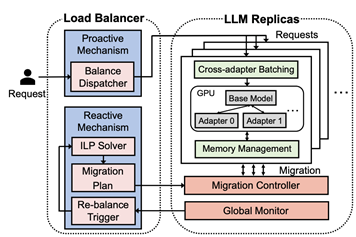 近年来,大型语言模型(LLM)的推断(inference)服务受到了广泛关注。然而,现有的推断系统在同时服务多个LoRA大模型时,存在同时服务多类请求资源利用率低以及负载不均的问题。为此,论文《dLoRA: Dynamically Orchestrating Requests and Adapters for LoRA LLM Serving》提出了一套多LoRA大模型的动态编排系统,旨在通过动态编排请求和LoRA适配器,提升LoRA大模型推断服务的效率。在实例层面,dLoRA根据请求分布动态在多类LoRA推断策略切换,实现计算效率和等待时长之间的更优权衡。在集群层面,dLoRA通过选择性预先加载LoRA adapter以及动态进行请求和LoRA adapter的协同迁移,实现集群层面负载均衡。实验结果表明,dLoRA相比单模型版本vLLM和HuggingFace PEFT提升吞吐至多50.7倍和30.5倍,相比同期工作S-LoRA,dLoRA可降低延迟至多1.8倍。该论文的第一作者为北京大学计算机学院2022级直博生吴秉阳(导师金鑫长聘副教授),作者包括北京大学朱睿冬、章梓立,上海人工智能实验室孙鹏,北京大学刘譞哲教授(通讯作者)和金鑫长聘副教授。