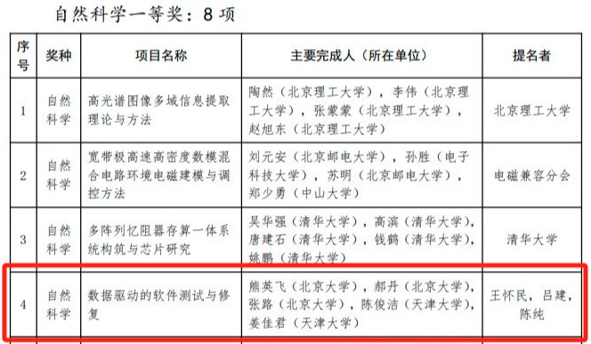 北京大学计算机学院软件科学与工程系熊英飞副教授、郝丹教授、张路教授、及其博士毕业生、天津大学陈俊洁副教授和姜佳君副研究员完成的项目“数据驱动的软件测试与修复”获得电子学会自然科学一等奖。软件测试与修复是提升软件质量的基本手段。该项目针对传统数据驱动方法无法处理程序语法语义,在测试和修复上难以发挥作用的问题,提出了数据驱动的程序合成框架,同时考虑语法语义的逻辑信息和数据的概率信息,并成功应用于测试和修复,显著超越传统测试与修复方法。在学术界推动形成了新的数据驱动测试与修复方向,成为后续大量工作的基础,被同行广泛引用和好评;在工业界推动测试与修复应用向数据驱动转变。