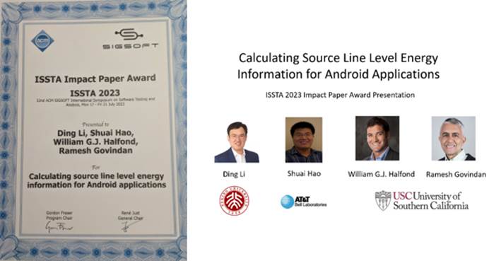 李锭老师获得2023年ISSTA Impact Paper Award的论文是他在2013年作为第一作者与其博士生导师William G.J. Halfond教授, 合作者Ramesh Govindan教授和博士生Shuai Hao共同完成的论文“Calculating Source Line Level Energy Information for Android Applications”,该论文首次提出了一种代码级的移动应用功耗采样测量方法,支持了后续一系列移动应用能耗优化技术,为移动应用的普及做出了积极贡献。该论文也是软硬件结合的经典论文之一,通过结合统计学习和软件分析,有效地将硬件测量的分辨率提高一个量级,大大降低了能耗分析的成本,为后续多个工作提供了范式。