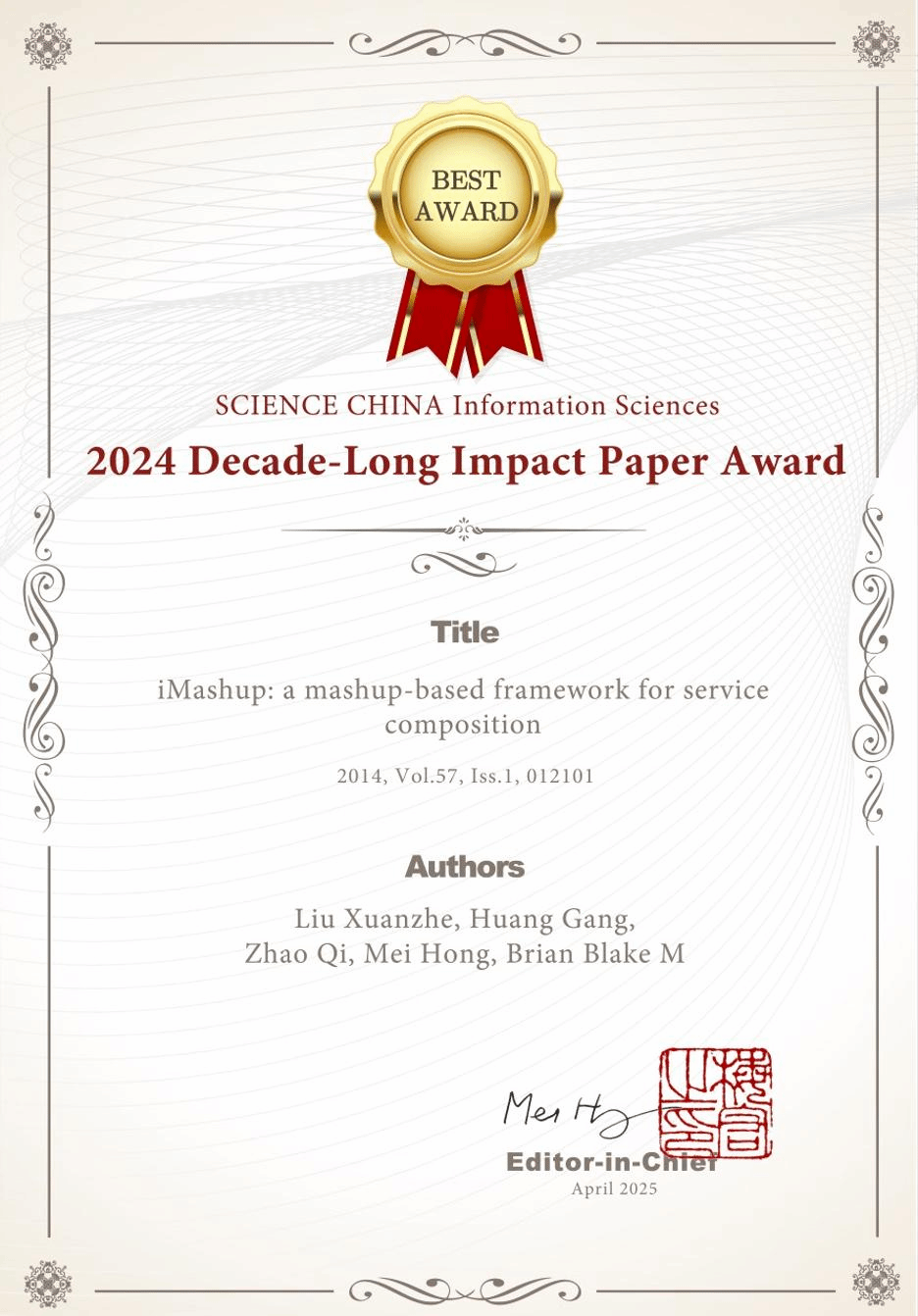 2025年4月30日,权威期刊SCIENCE CHINA Information Science(《中国科学:信息科学》)官方公布了2024年优秀论文评选结果。计算机学院刘譞哲教授作为第一作者发表于2014年的论文《iMashup: a mashup-based frame...