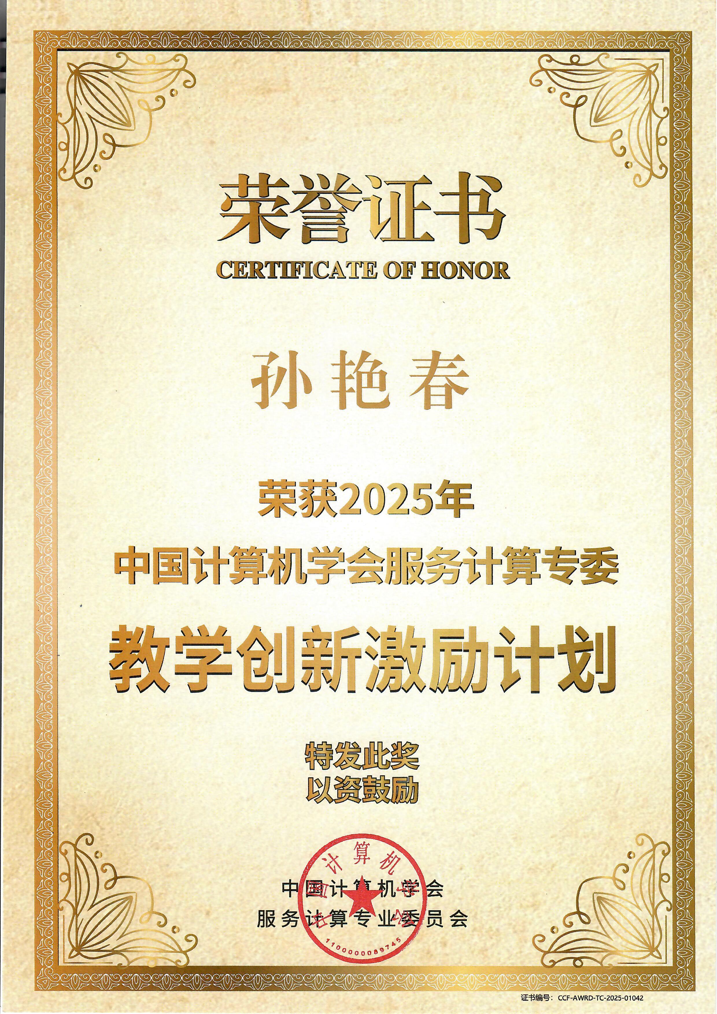 孙艳春副教授于2025年8月荣获2025年中国计算机学会服务计算专委教学创新激励计划。该奖项授予为服务计算、软件工程等相关领域学科发展、专业建设、课程建设等做出突出贡献的现任中国计算机学会服务计算专委委员。...